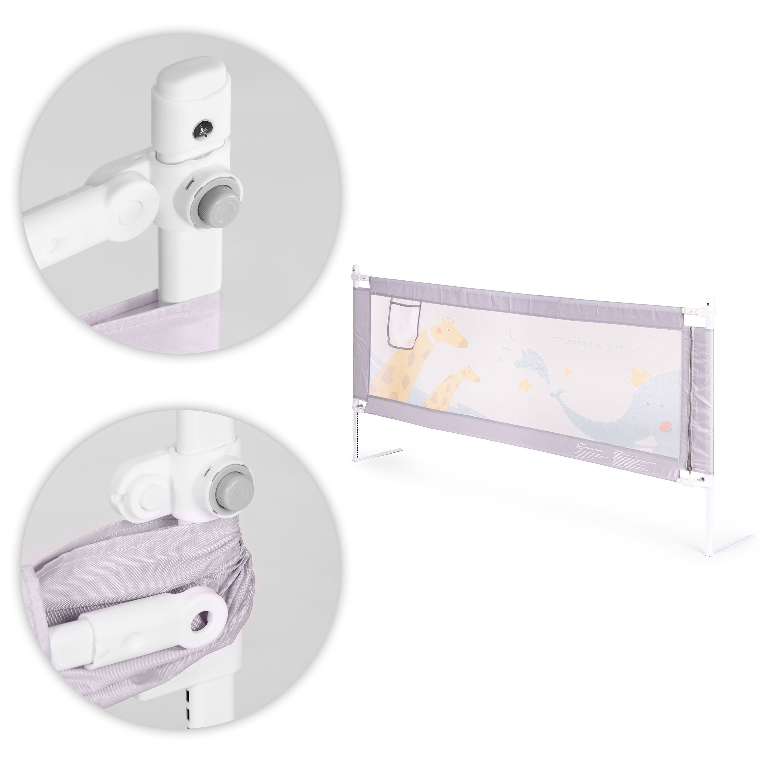 • Barierka posiada przycisk umożliwiający regulację wysokości, dzięki czemu można ją dostosować do różnych grubości materacy. To rozwiązanie sprawia, że osłona zawsze idealnie przylega do łóżka, zwiększając bezpieczeństwo użytkowania.