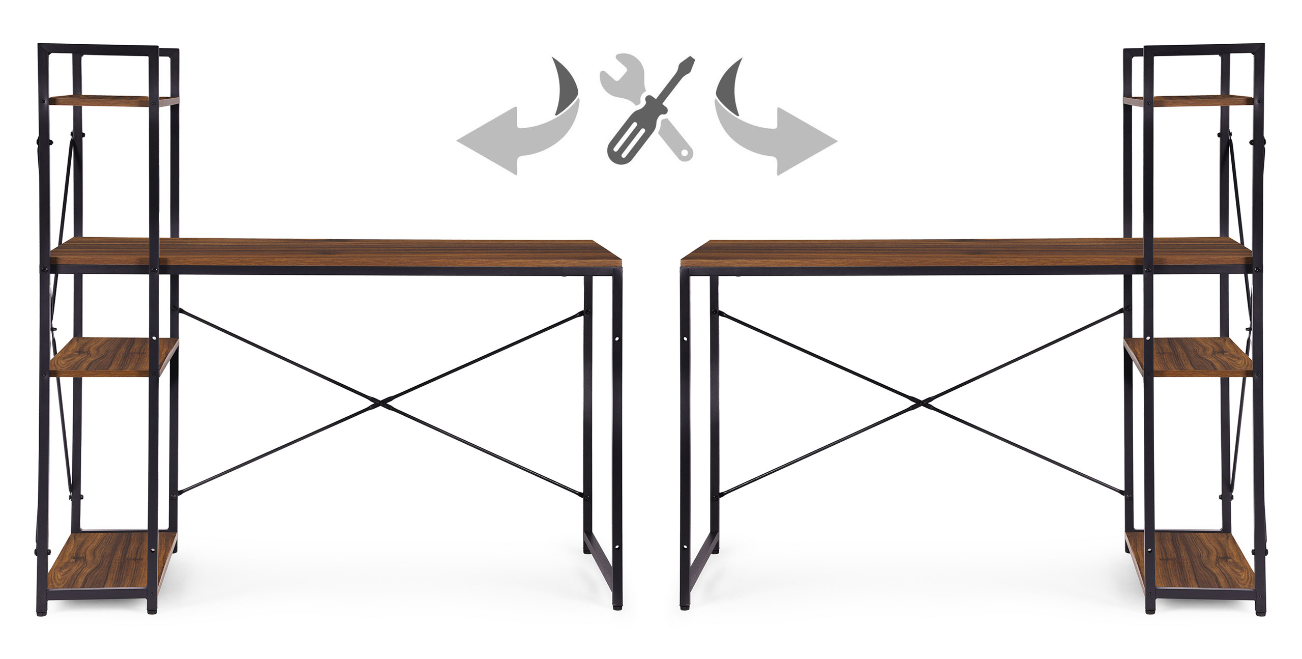 Regał zintegrowany z biurkiem to praktyczne rozwiązanie, które zwiększa funkcjonalność całego mebla. Trzy przestronne półki zapewniają dodatkowe miejsce na książki, dokumenty, sprzęt biurowy lub dekoracje. Regał można zamontować po lewej lub prawej stronie, co pozwala lepiej dopasować biurko do układu pomieszczenia i indywidualnych potrzeb użytkownika.