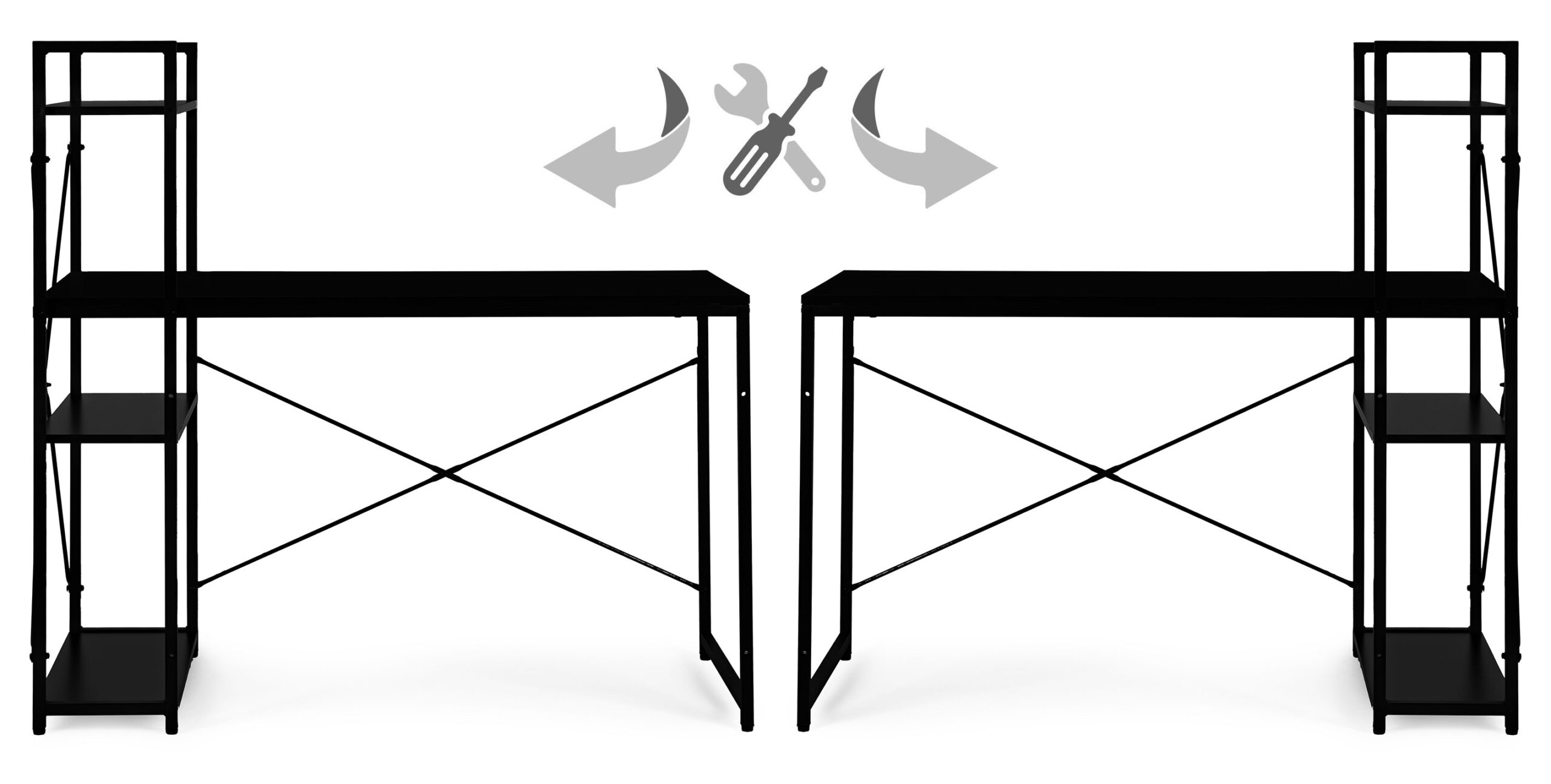 Regał zintegrowany z biurkiem to praktyczne rozwiązanie, które zwiększa funkcjonalność całego mebla. Trzy przestronne półki zapewniają dodatkowe miejsce na książki, dokumenty, sprzęt biurowy lub dekoracje. Regał można zamontować po lewej lub prawej stronie, co pozwala lepiej dopasować biurko do układu pomieszczenia i indywidualnych potrzeb użytkownika.