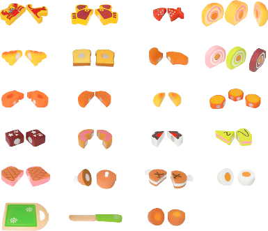 Produkty składają się z dwóch i trzech części połączonych rzepem, dzięki możliwości przekrojenia, dziecko zobaczy jak dany produkt wygląda od środka. Każdy z nich został wykonany z dużą dbałością o detale. W zestawie znajduje się również drewniana deska oraz nóż do krojenia. Ponieważ elementy połączone są rzepem, podczas krojenia rzep stawia opór i wydaje dźwięk, jak podczas krojenia prawdziwych produktów.