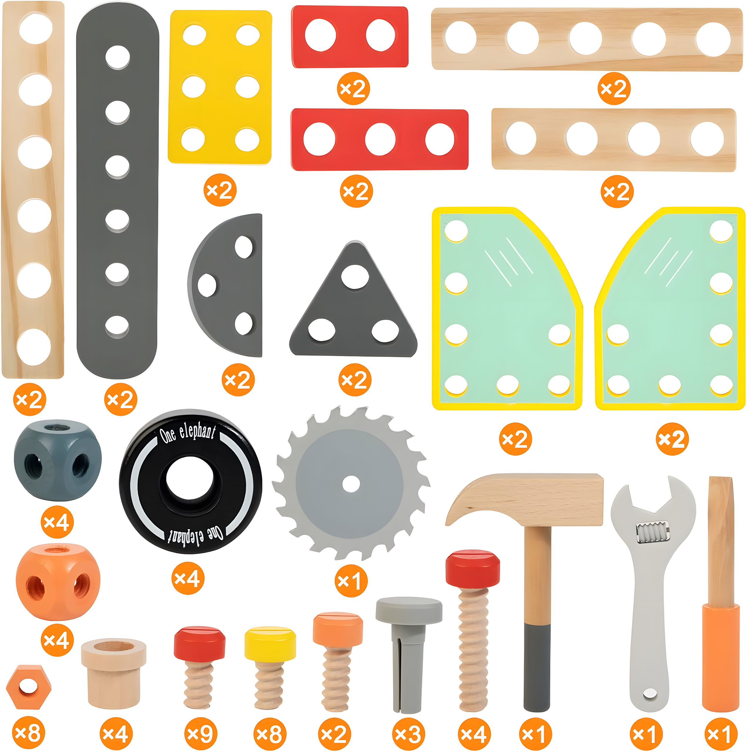 Wraz z warsztatem dostępne są dodatkowe elementy, dzięki którym Twoja pociecha zbuduje aż 9 różnych zabawek takich jak: robot, rower, statek i wiele innych. Do ich wybudowania dołączono bezpieczne, drewniane elementy, pozbawione ostrych krawędzi oraz instrukcję z pomysłami na nowe budowle. W ten sposób maluch będzie mógł samodzielnie odtworzyć lub stworzyć według własnych pomysłów zupełnie nowe konstrukcje.