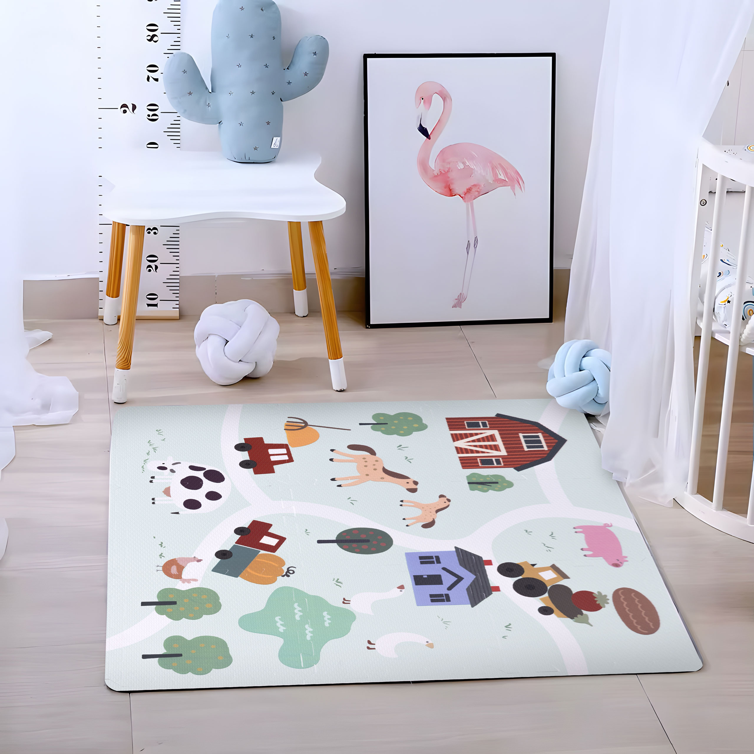 Mata przedstawia kolorowy wzór farmy, pełen pojazdów a także zwierząt gospodarczych i wiejskich krajobrazów. Dzięki temu zapewnia dzieciom kreatywną i fascynującą formę zabawy, idealną dla małych miłośników wsi. Każdy szczegół na macie został starannie zaprojektowany, z dbałością o detale, aby zachęcić dzieci do odkrywania i interakcji z otoczeniem. Wyraźne kolory i realistyczne ilustracje wzbudzają zainteresowanie i rozwijają wyobraźnię, zapraszając do tworzenia własnych przygód na farmie.