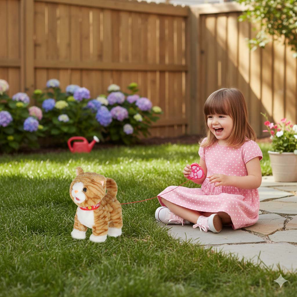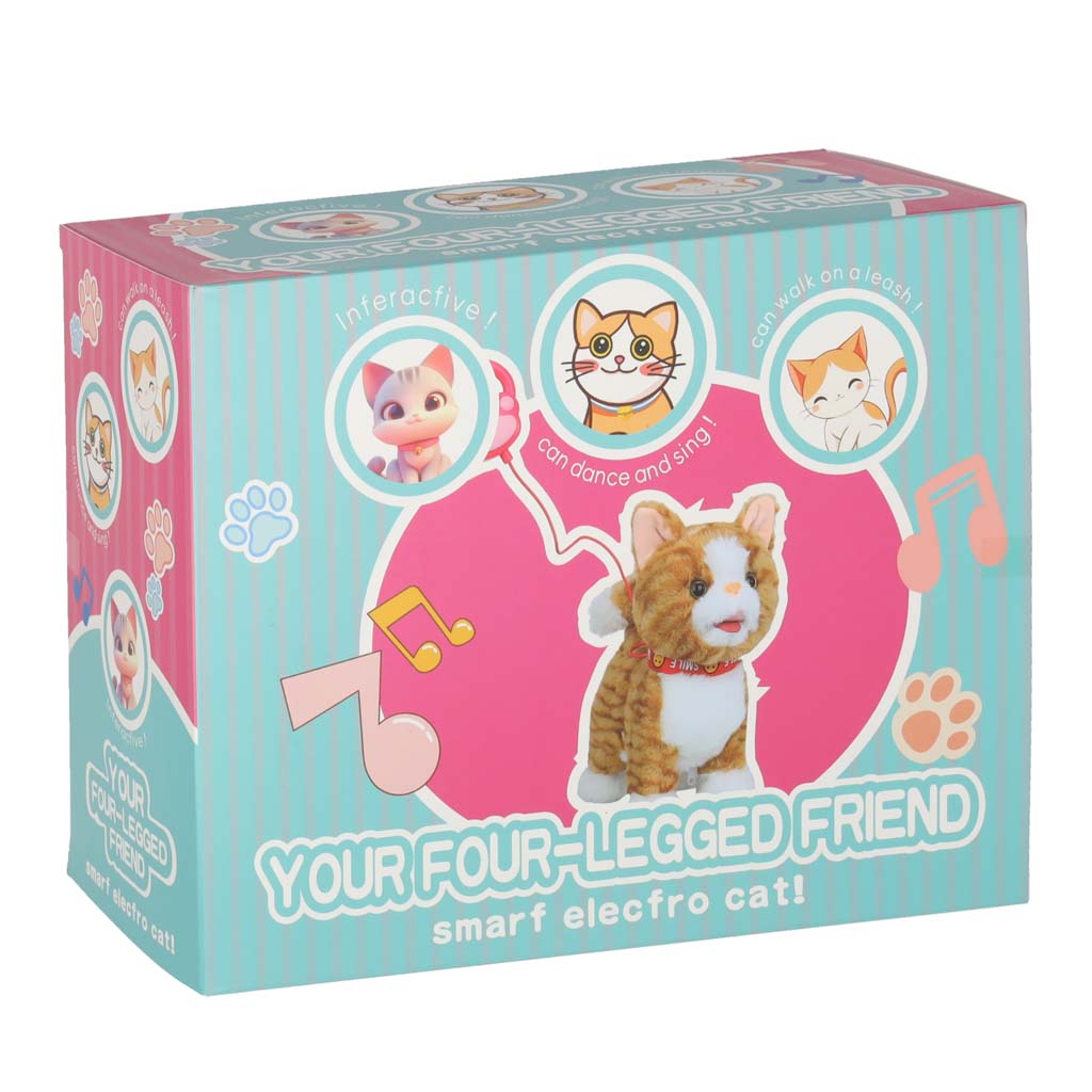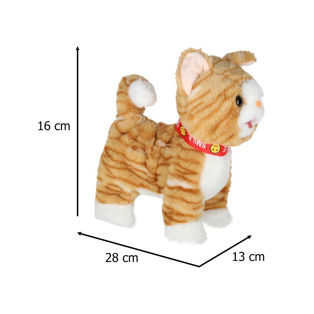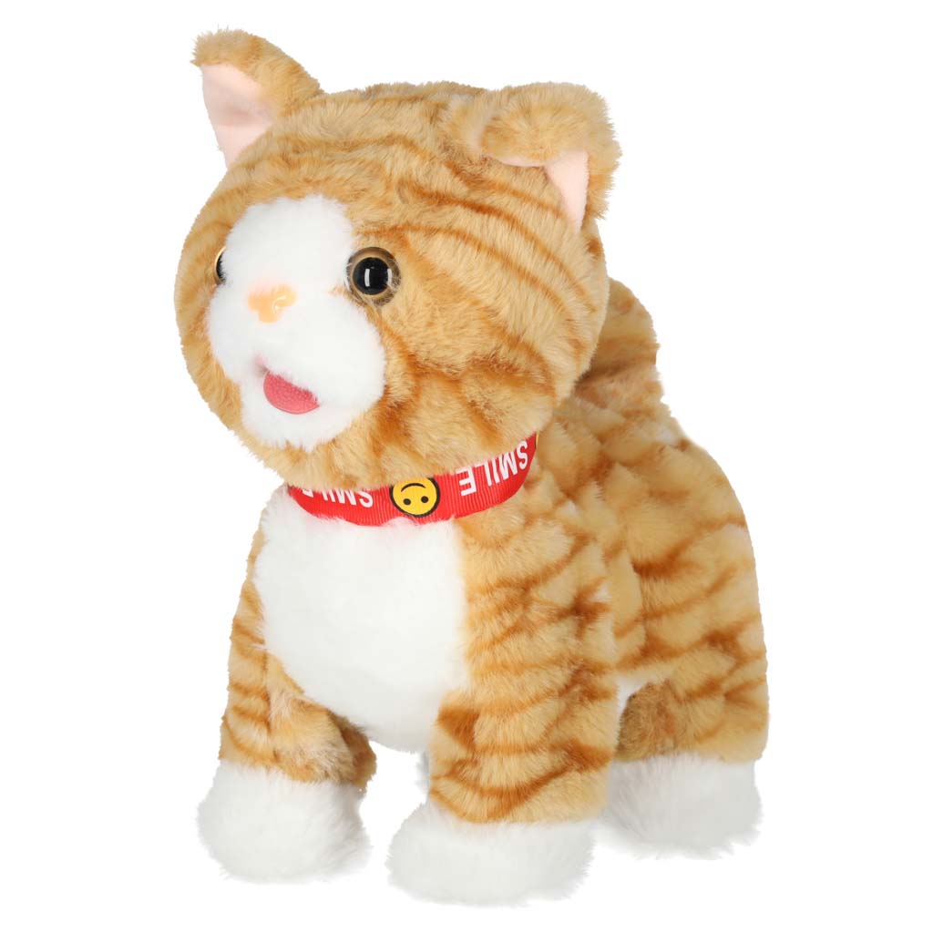 kotek na smyczy będzie pluszowym towarzyszem zabaw Twojego dziecka. Działa na