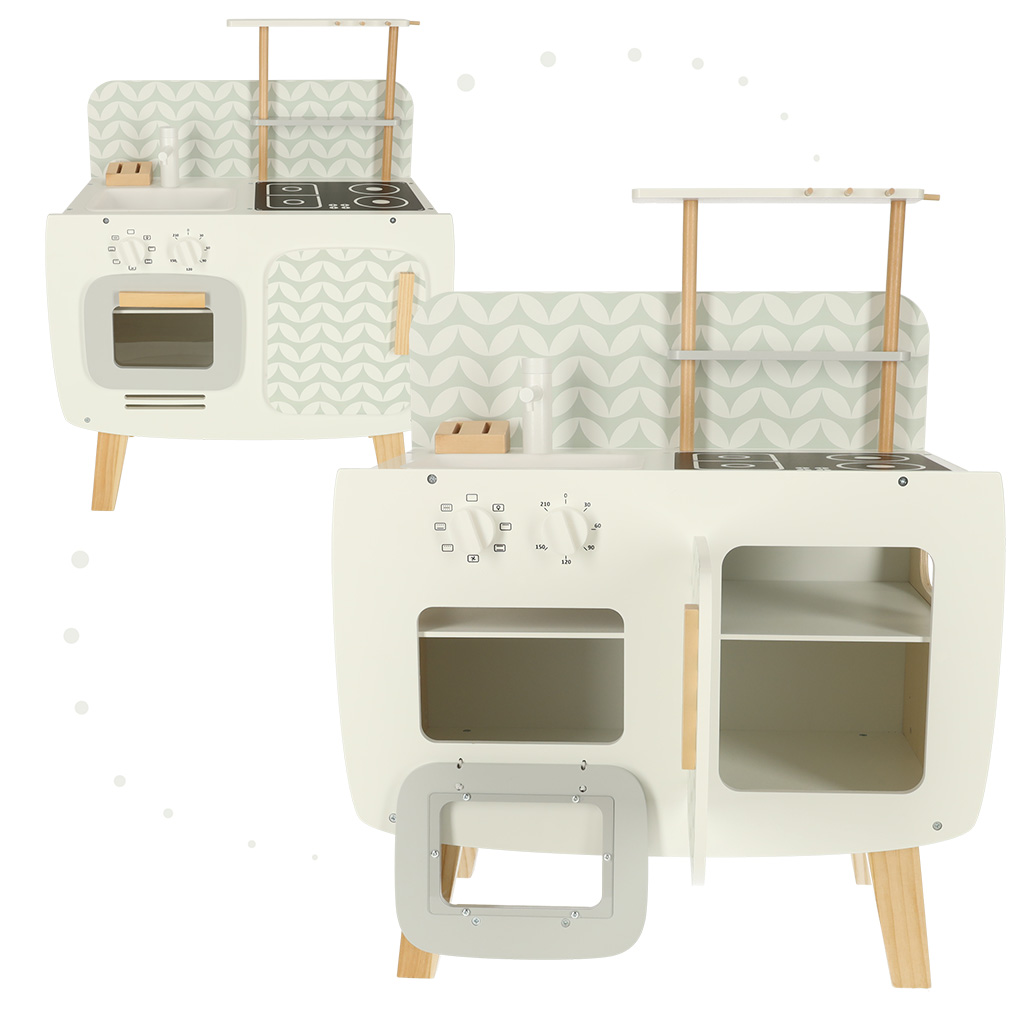 Design kuchni jest zachowany w stonowanych i jasnych kolorach, aby zabawka mogła wpasować się w każdy pokój dziecięcy, dzięki czemu będzie nie tylko centrem rozrywki, ale również piękną ozdobą.
