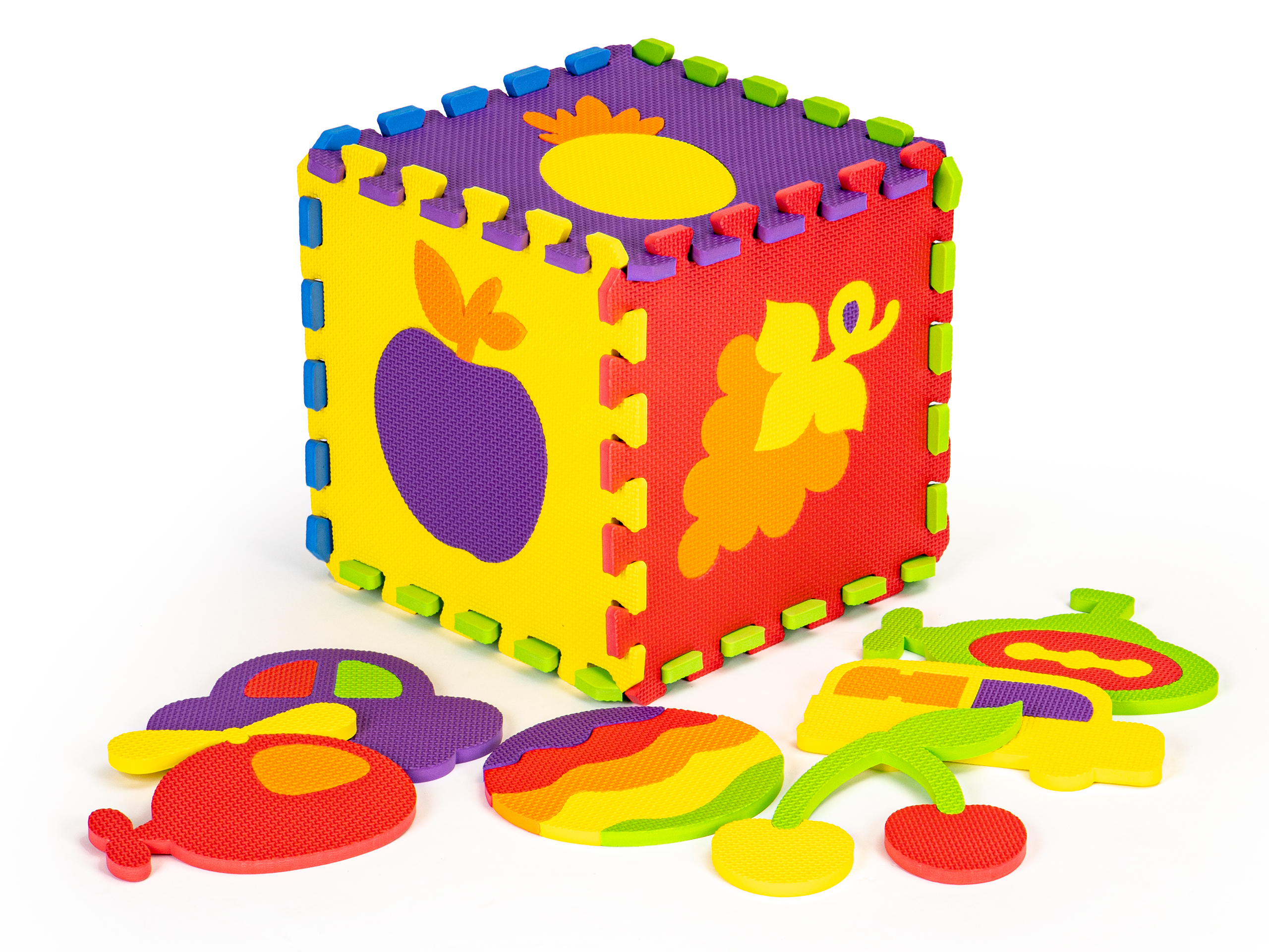 Ponieważ mata łączy się jak puzzle, można zbudować z niej wieżę, kostki i inne konstrukcje, które wymyśli dziecko. Każdy obrazek można wyjąć z kwadratu, dzięki temu można bawić się w ich układanie i dopasowywanie, a dodatkowo maluch będzie miał okazję nauczyć się nazw owoców i pojazdów.