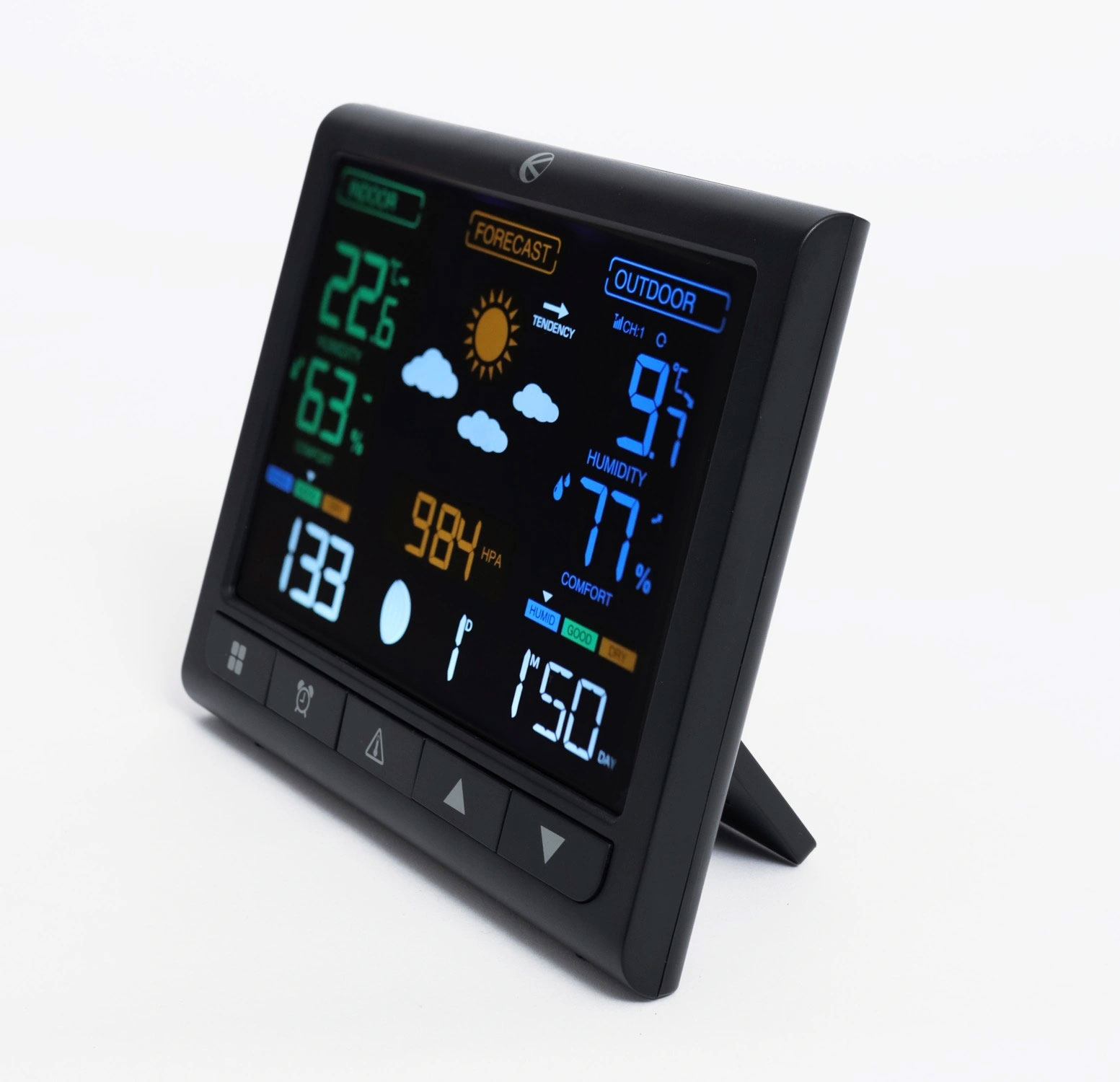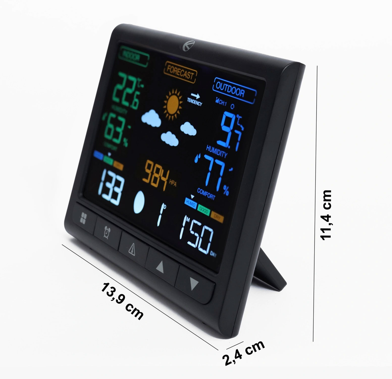 Ta nowoczesna, bezprzewodowa stacja pogodowa to niezawodne narzędzie do monitorowania warunków atmosferycznych, które sprawdzi się zarówno w domu, jak i w biurze. Stacja jest wyposażona w radiowo sterowany zegar, który automatycznie synchronizuje się z sygnałem czasu, eliminując konieczność ręcznego ustawiania godziny. To szczególnie przydatna funkcja, zapewniająca zawsze precyzyjne wskazanie czasu, bez względu na zmiany stref czasowych czy przestawienie zegara na czas letni i zimowy. Czytelność informacji gwarantuje duży, kolorowy wyświetlacz LCD z możliwością regulacji jasności. Dzięki temu, wartości są doskonale widoczne zarówno w ciągu dnia, jak i w nocy, co sprawia, że stacja jest idealnym rozwiązaniem dla osób w każdym wieku, w tym seniorów.
