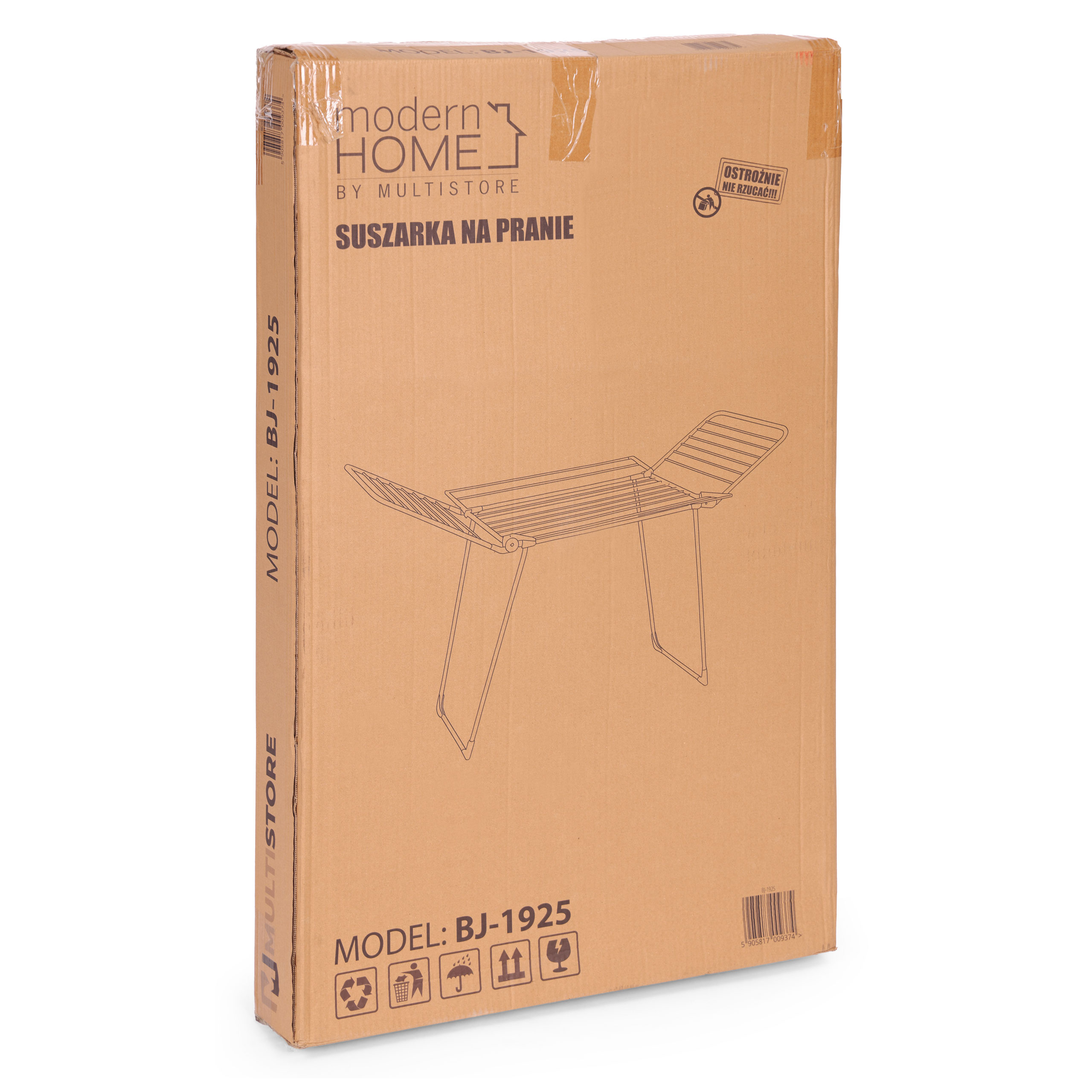 Suszarka została zaprojektowana z myślą o wygodnym przechowywaniu – jej składanie jest szybkie, intuicyjne i nie wymaga użycia siły. Po złożeniu zajmuje minimalną ilość miejsca, dzięki czemu bez problemu zmieści się w szafie, za drzwiami lub obok pralki. Dodatkowo zastosowano praktyczną blokadę skrzydeł, która zapobiega samoczynnemu rozkładaniu się konstrukcji, ułatwiając jej bezpieczne przenoszenie i przechowywanie.