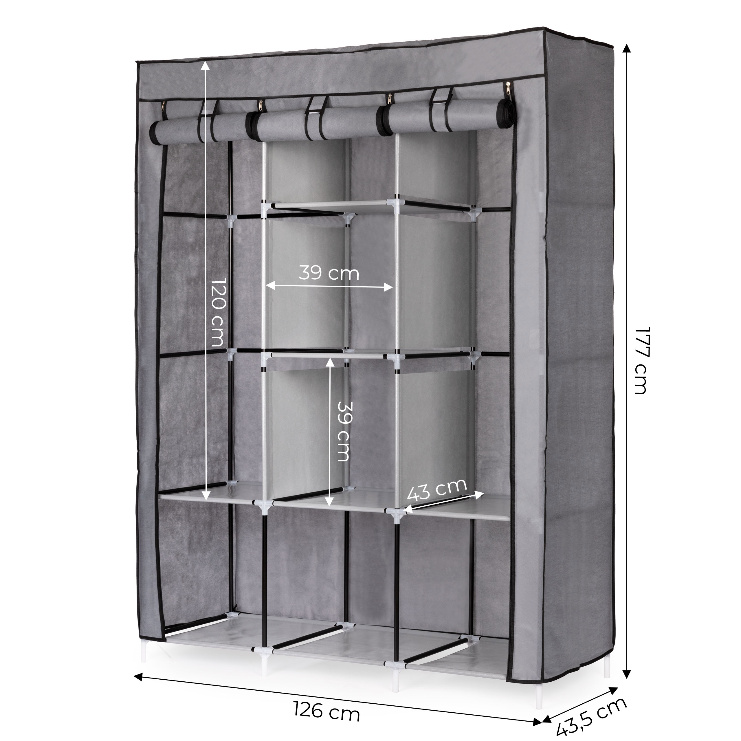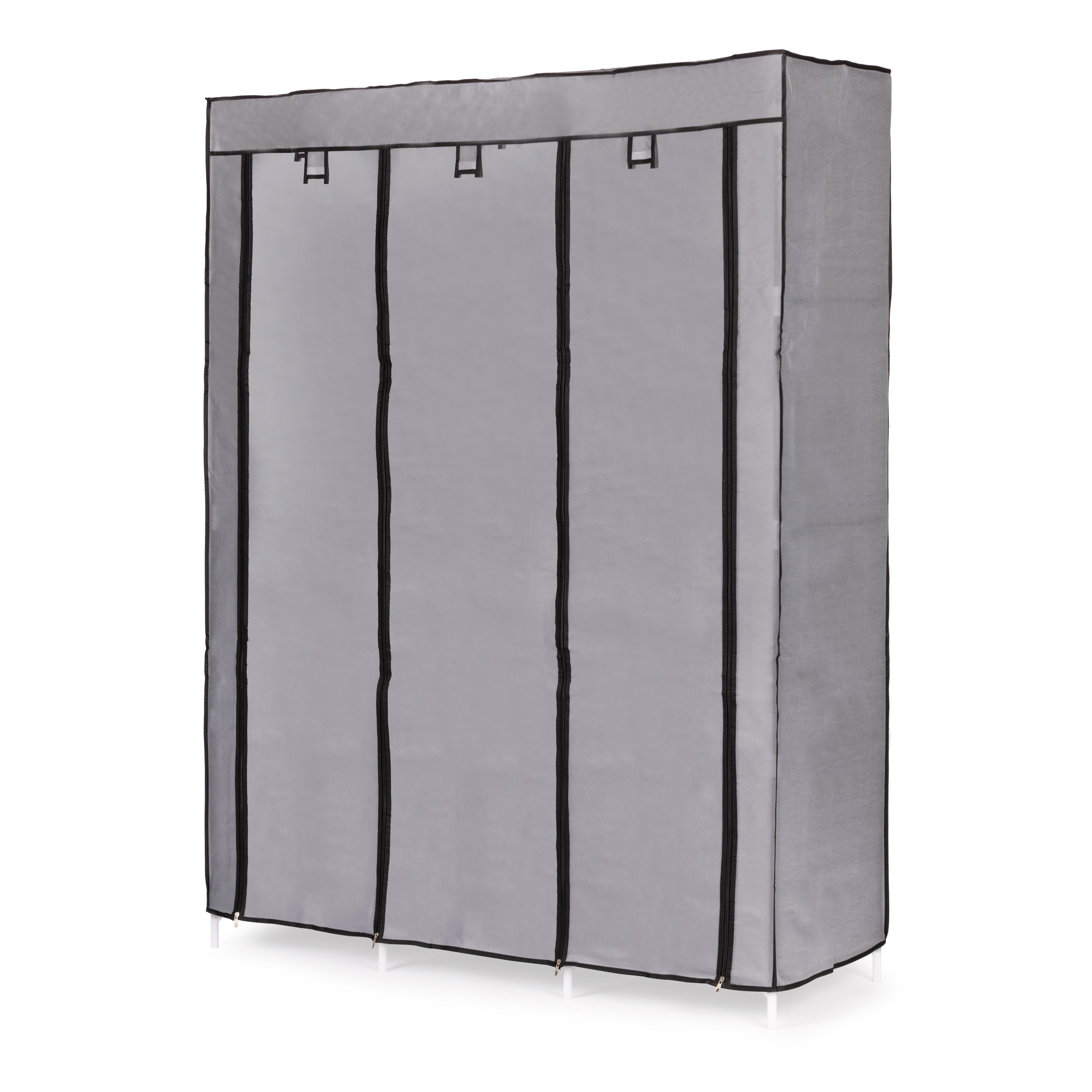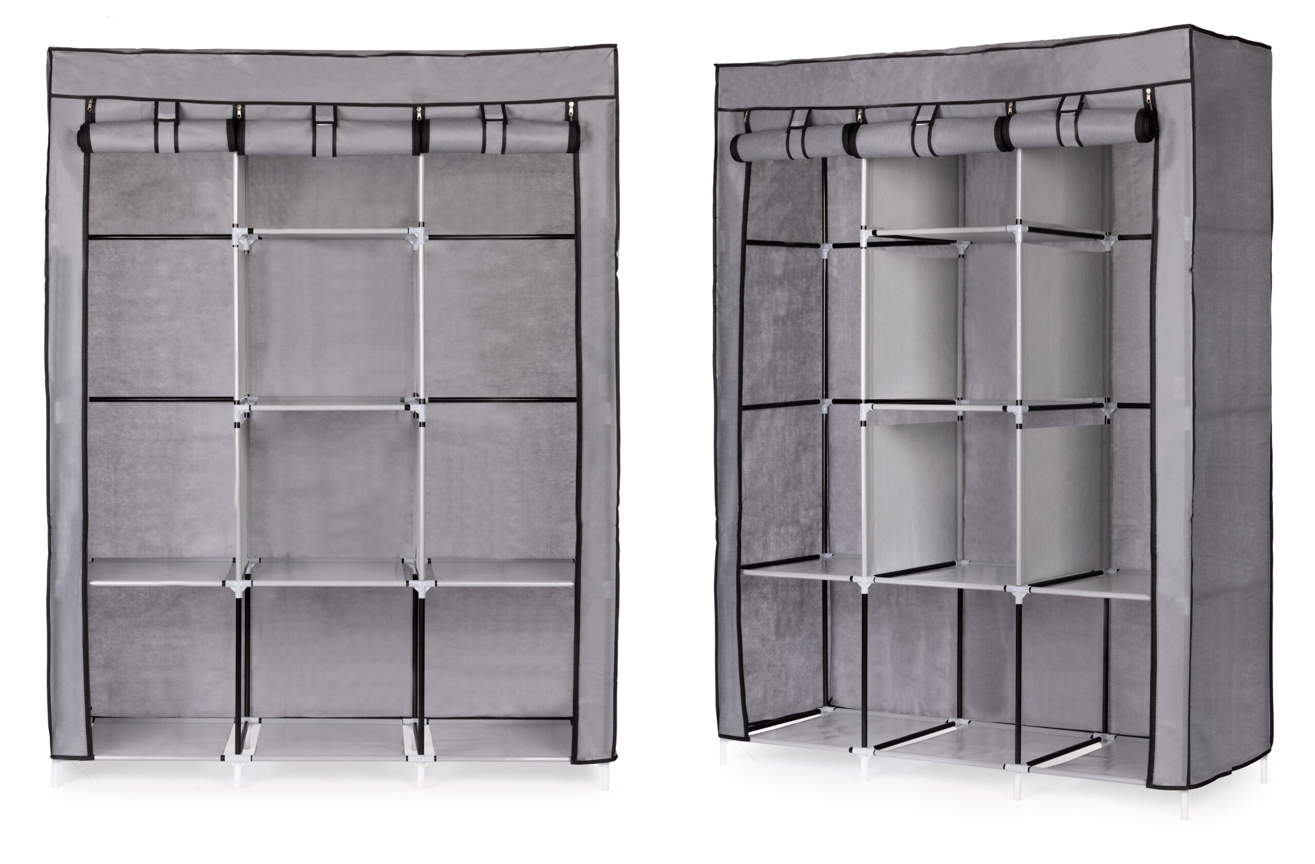 - Podwijana zasłona: zamiast drzwi jak w tradycyjnej szafie, ten model posiada cztery zamki błyskawiczne i podwijany materiał, który w razie potrzebny można rozwinąć, zapiąć i dzięki temu szczelnie zamknąć swoją szafę.