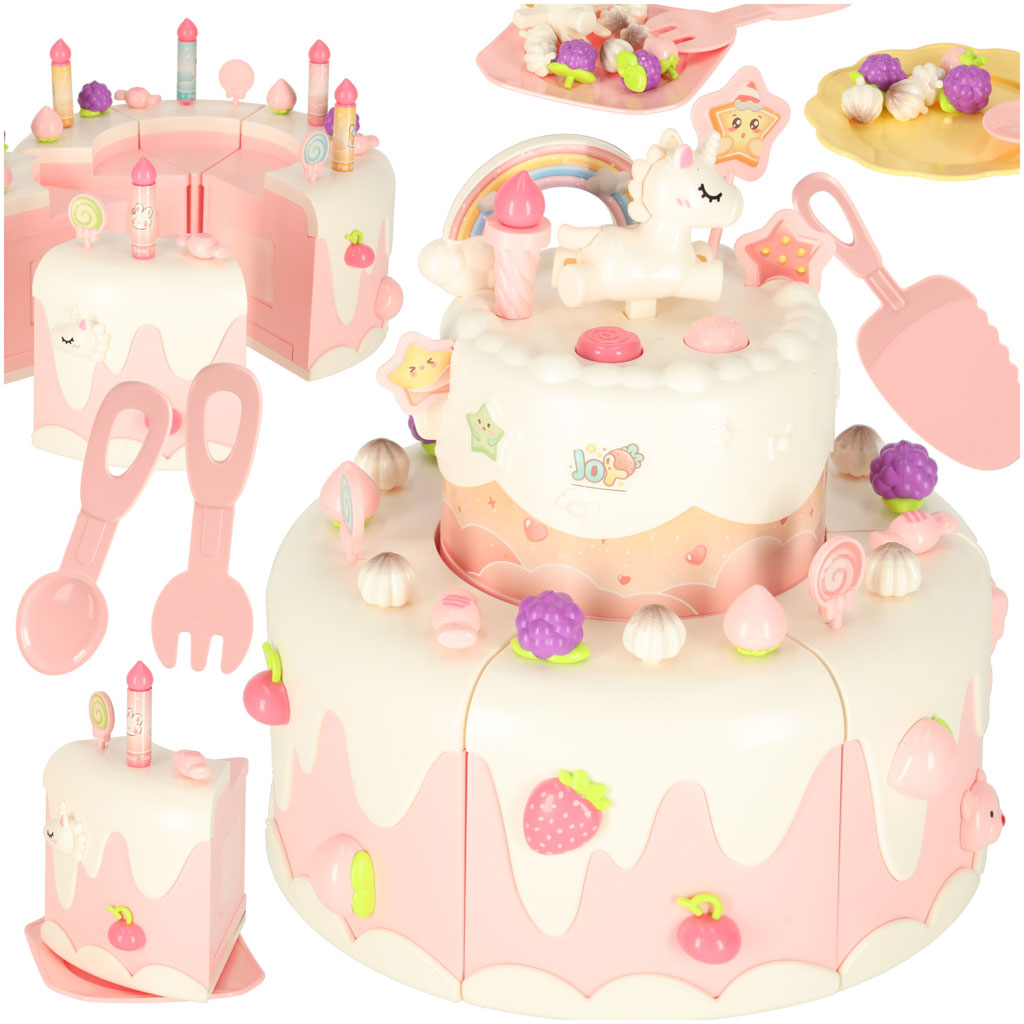 Tort urodzinowy piętrowy do krojenia na rzepy muzyka światła kuchnia 16 elementów różowy