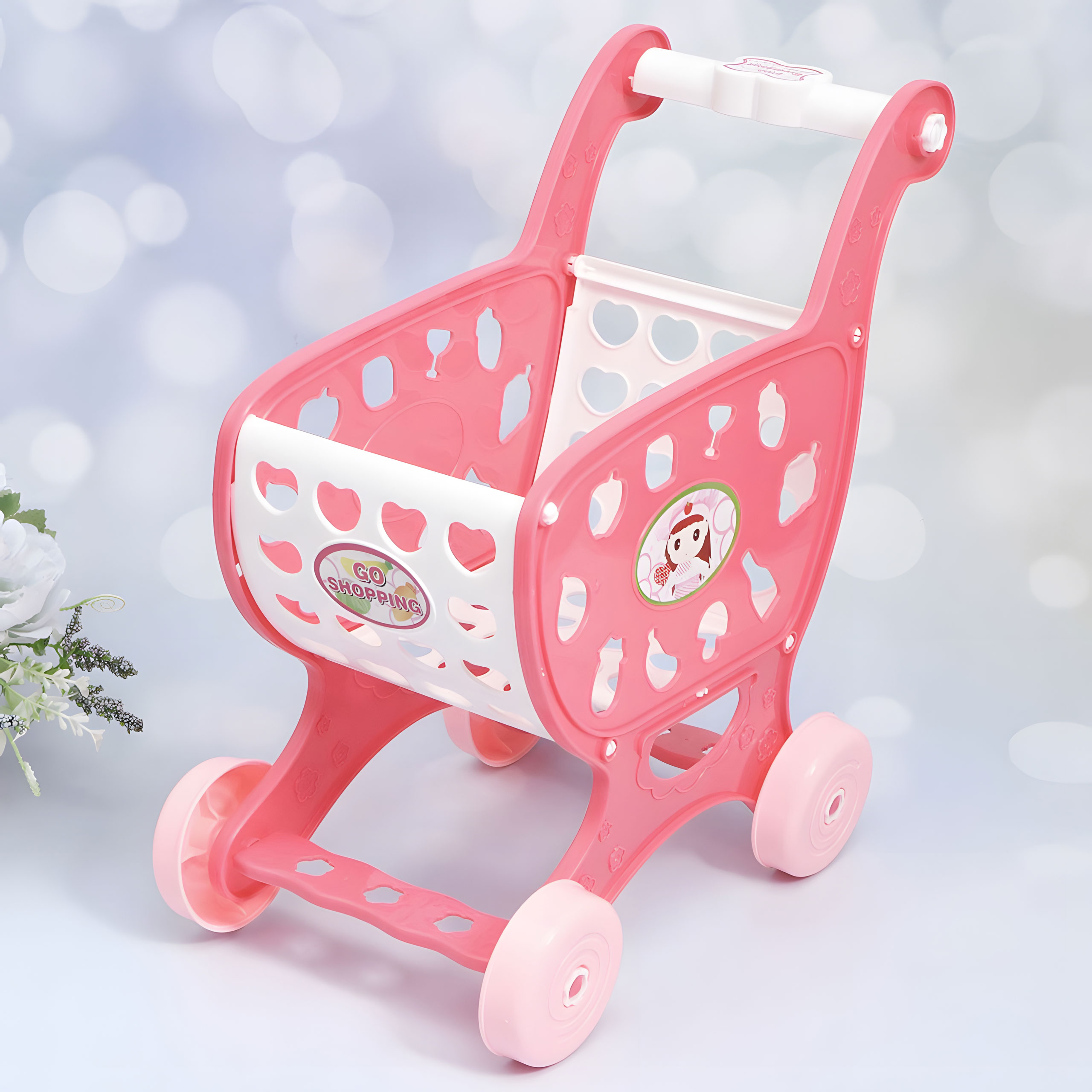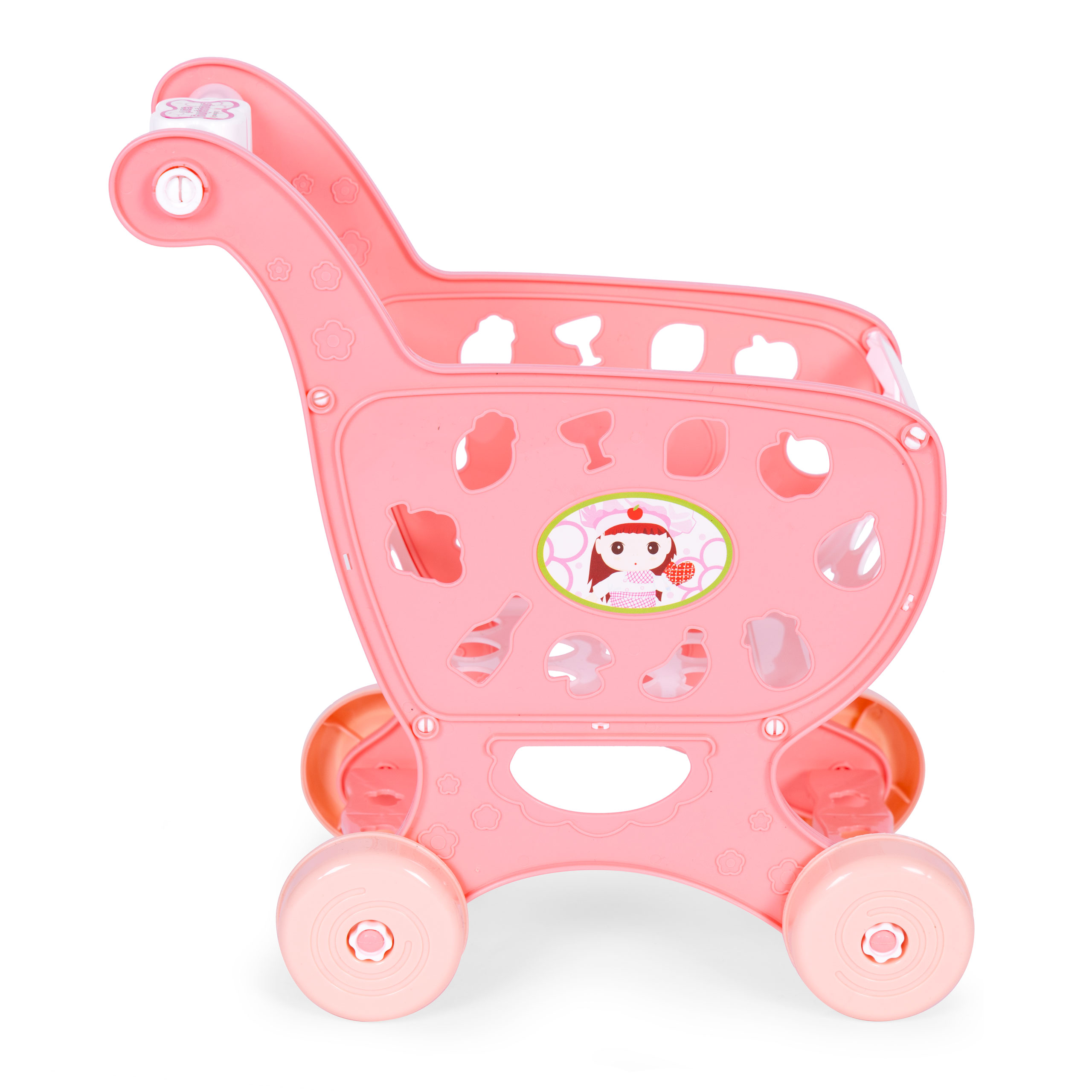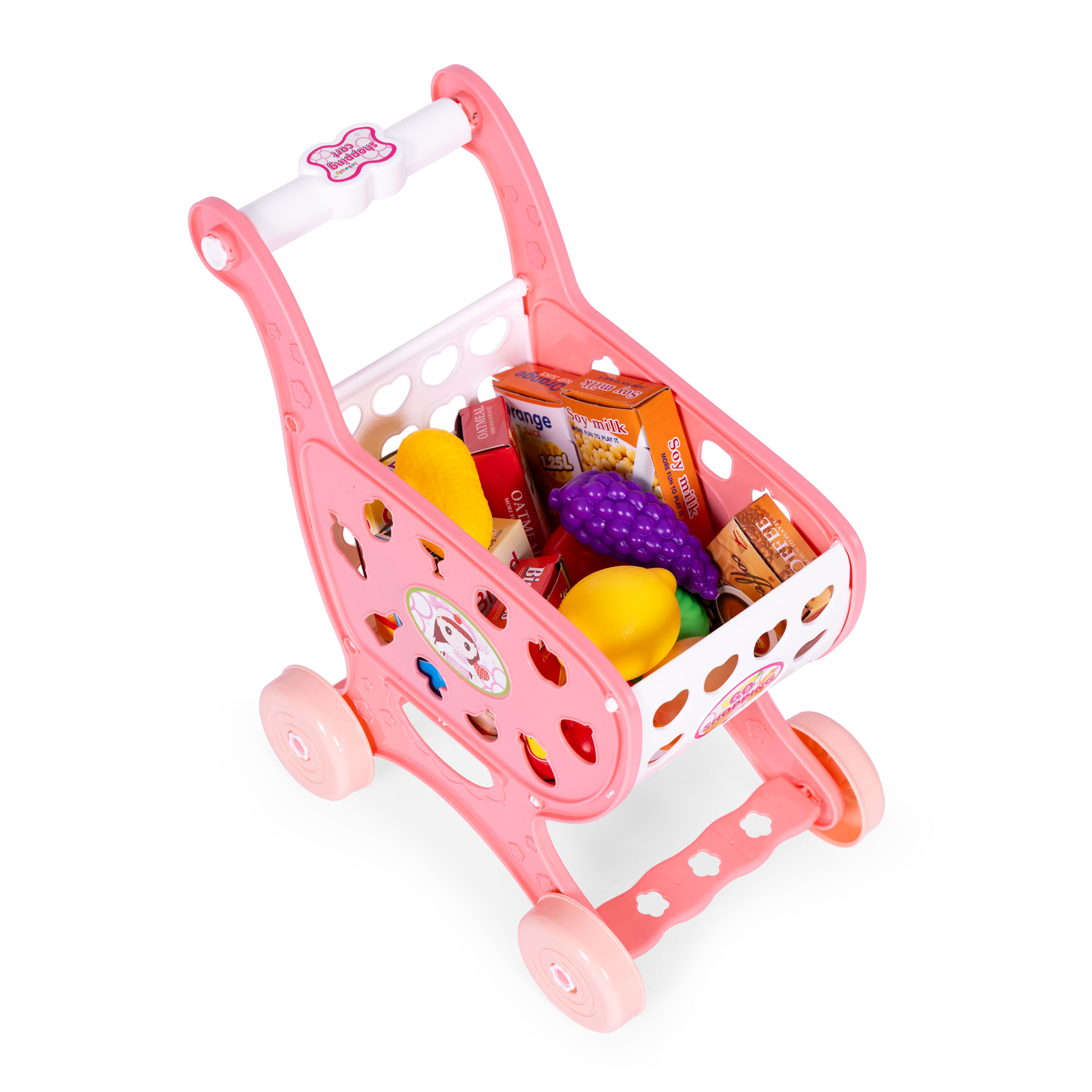 Wózek na zakupy sklepowy do supermarketu kuchni + 18 akcesoriów różowy