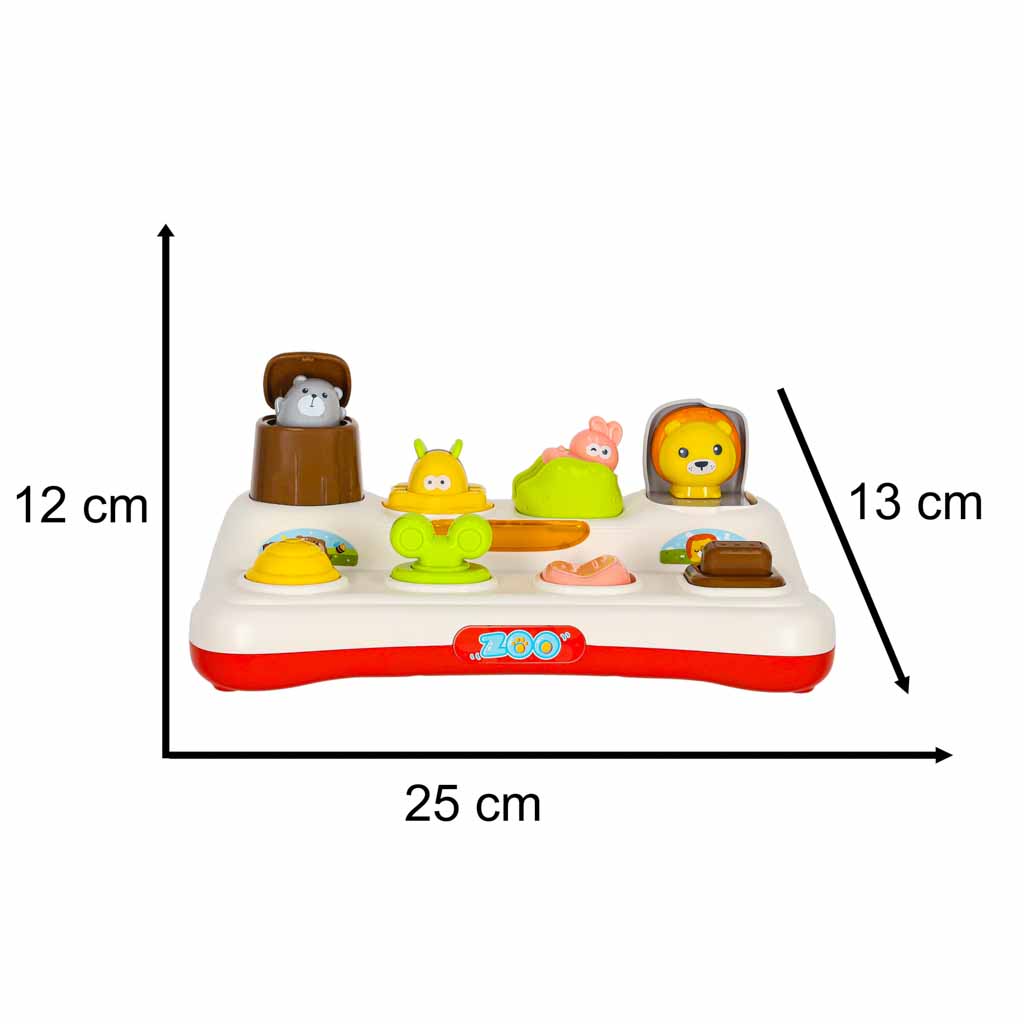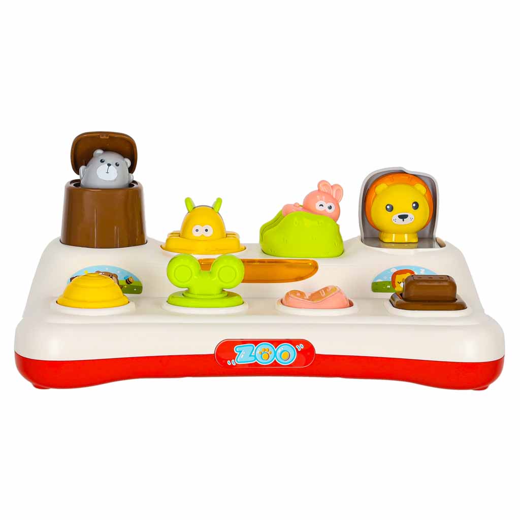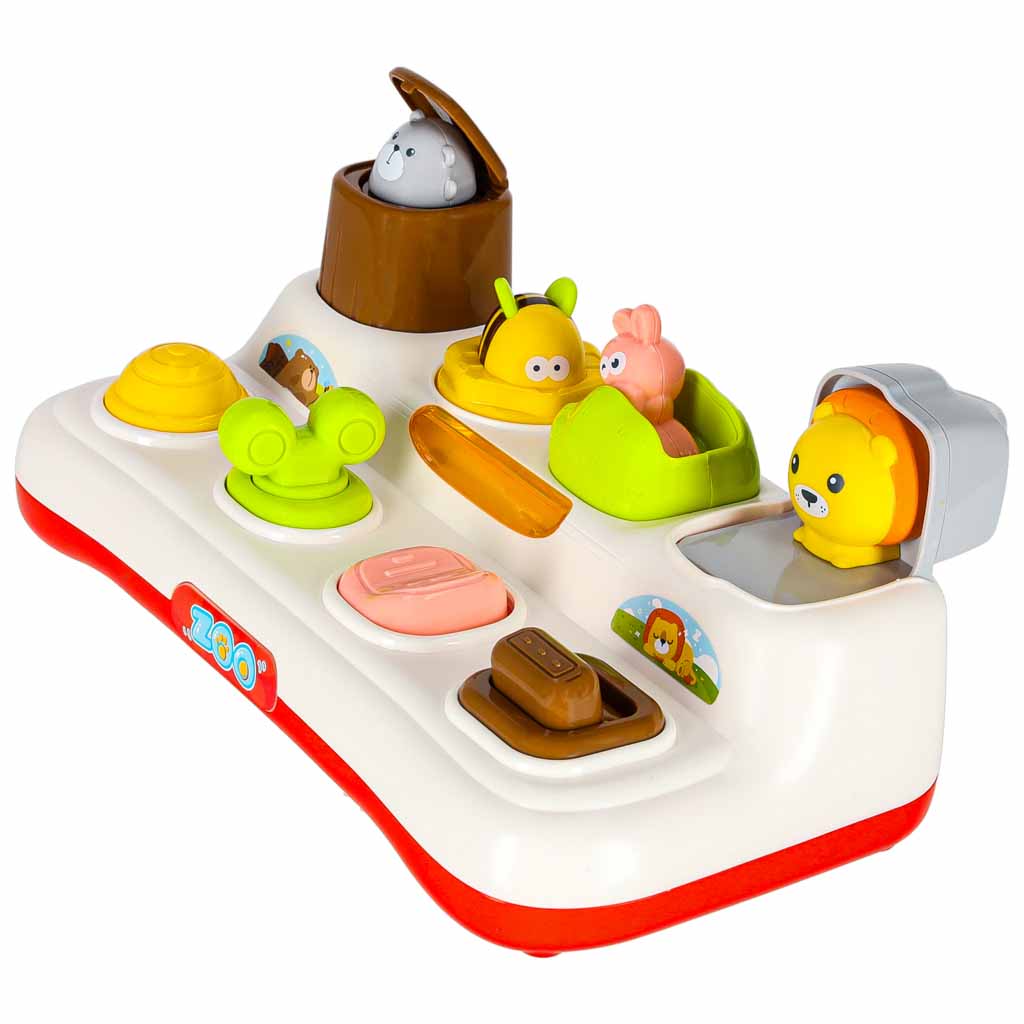 Zabawka powstała w duchu edukacyjnym Montessori. Jako interaktywna zabawka wyposażona jest w cztery przyciski, z których każdy uruchamia inny mechanizm działania. Wyskakujące kolorowe zwierzątka wspierają rozwój motoryki małej, jednocześnie wprowadzając zabawę w nurcie STEM poprzez ruch, logiczne zależności i pierwsze doświadczenia z mechaniką działania. To wciągająca zabawa, doskonały trening i wyjątkowa zabawka, która zapewni maluchowi radość i idealnie sprawdzi się jako prezent.