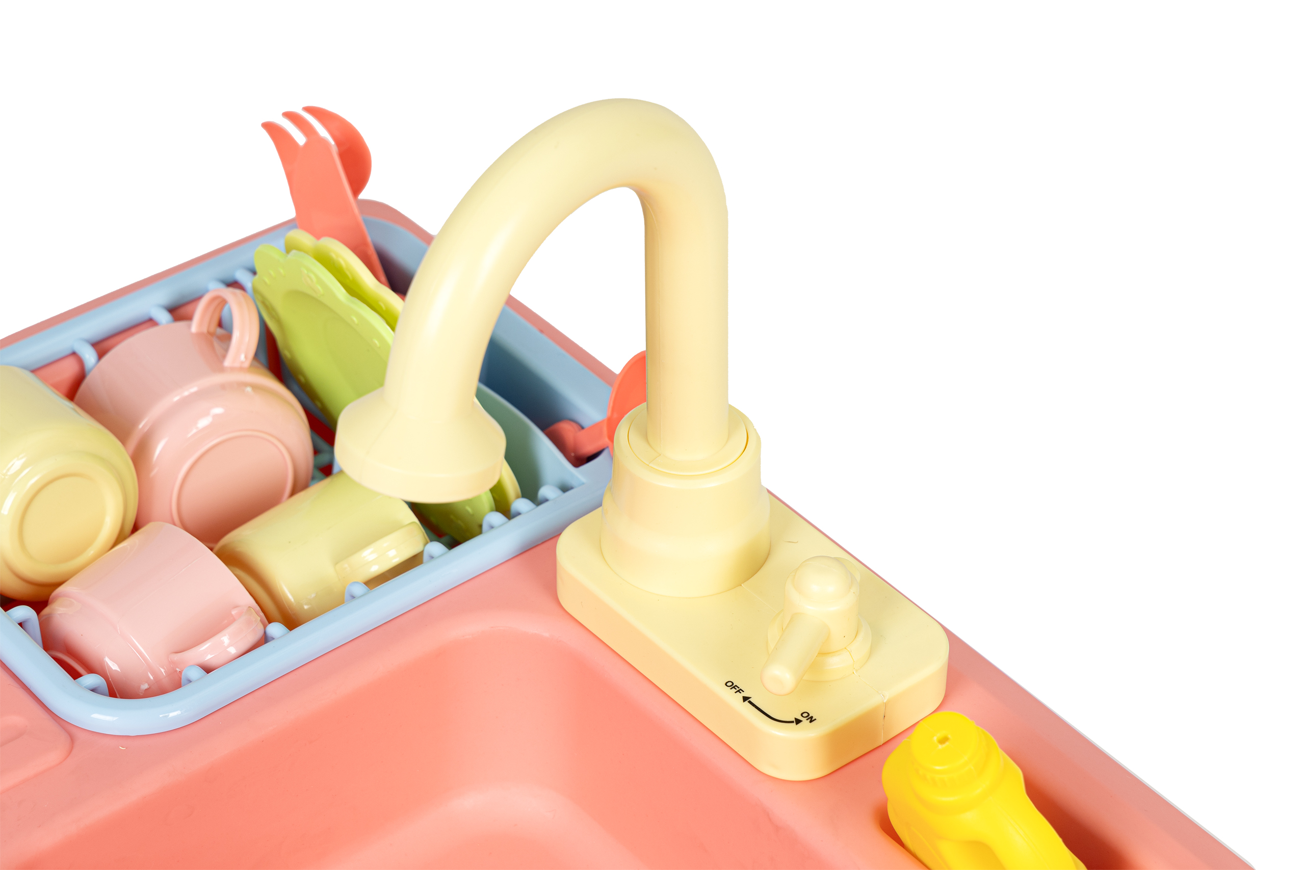 Zabawka została zaprojektowana na wzór prawdziwego, spotykanego w każdej kuchni zlewu, dzięki temu zabawa jest bardzo wciągająca. Po jego prawej stronie znajduje się wyciągana suszarka do odkładania umytych talerzy, filiżanek i sztućców, a obok kranu umieszczono specjalne miejsce na płyn i szczotkę do szorowania. Tuż pod kranem znajduje się mały kurek uruchamiający strumień wody, która wpada do komory zlewu, a dalej do odpływu i miski aby dzięki pompce znów trafić do kranu.